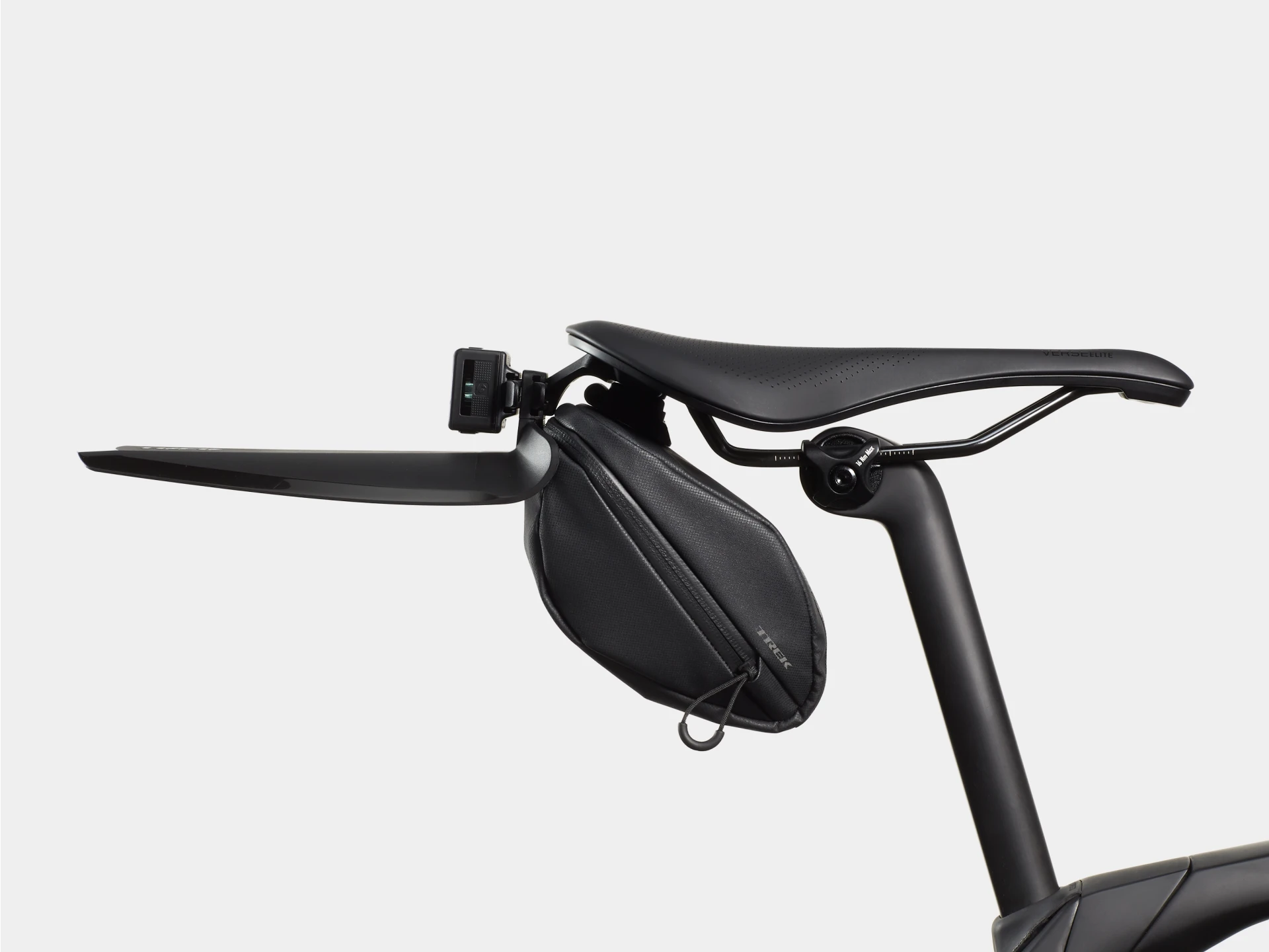 Uma bolsa de selim segura, de montagem direta, com ligações rápidas para o Blendr Fendr e luzes traseiras.